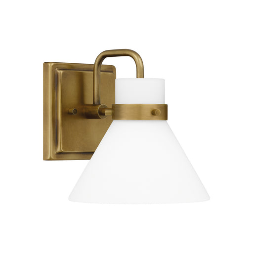 An opal-etched shade casts a warm, milky glow in the Regency sconce. Finished in your choice of polished chrome or weathered brass, the design spea...