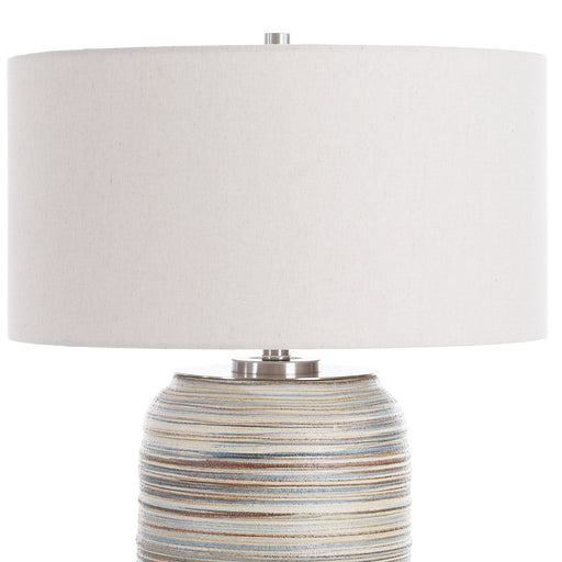 This Ceramic Accent Lamp Showcases A Larger, Striped Base In Muted Hues Of Brown, Taupe, Cream, And Blue, Highlighted By Delicate Brushed Nickel-pl...