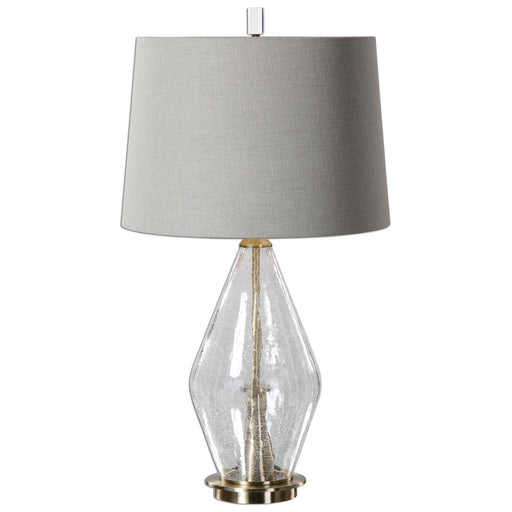 Clear Crackled Glass Base Accented With Plated Brushed Brass Details. The Tapered Round Hardback Shade Is A Light Gray Linen Fabric.Details:Product...