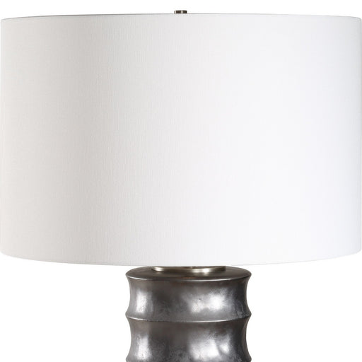 The Parilli Table Lamp Showcases An Organic Shaped Ceramic Base With Deep Vertical Channels And Wavy Ridges, Finished In A Taupe Gray Glaze And Pai...