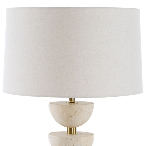 The Meridian Table Lamp Features Stacked Travertine Half-spheres On A Central Plated Brass Base With A Matching Foot. The Slightly Tapered Round Ha...