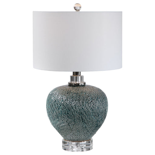 Showcasing A Refined Coastal Style, This Table Lamp Has A Ceramic Base Finished In An Aqua And Teal Crackle Glaze With Touches Of Rust Brown. Polis...