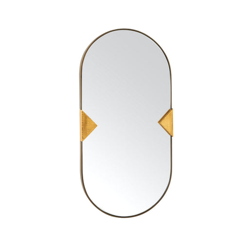 Dramatic clips of antique brass iron clasp an oval mirror like the setting of a diamond ring. Finished with a grid-like texture to recall forged ar...