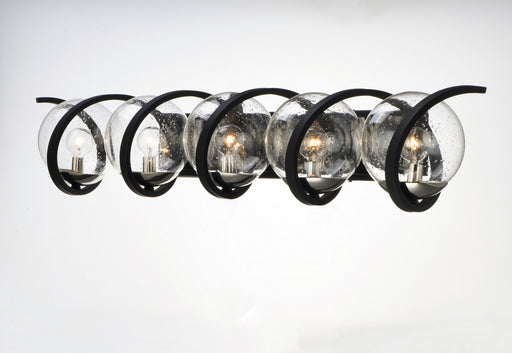 Rectangular metal channel, finished in Black, is meticulously formed in a curl design to create a unique and dramatic design. Clear Seedy glass bal...