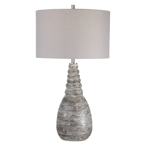 A Nod To Old-world Style, This Ceramic Table Lamp Features A Distressed Cream And Beige Crackle Glaze With A Deep Ribbed Texture, Accented By Brush...