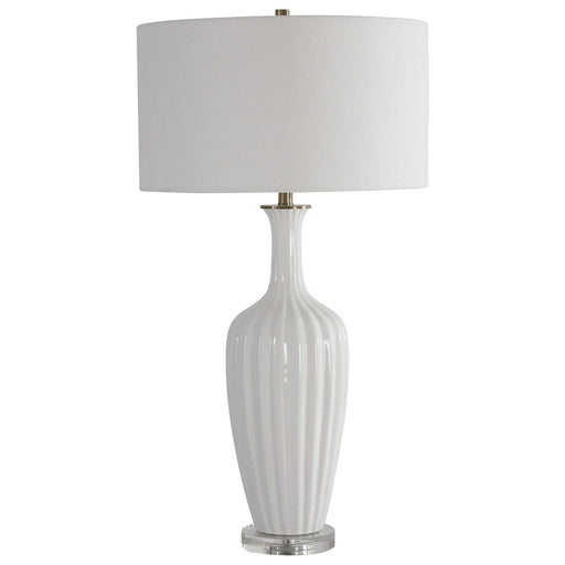 Showcasing A Sleek And Contemporary Look, This Ceramic Table Lamp Is Finished In A Stark White Glaze With Striking Polished Nickel Plated Iron Deta...