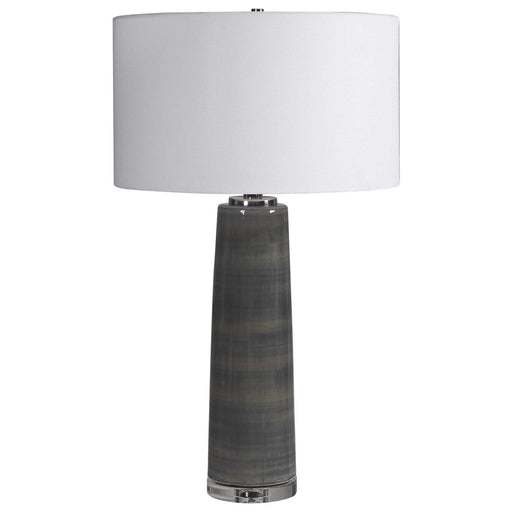 Simple And Contemporary, This Ceramic Table Lamp Showcases A Subtle Striped Charcoal Gray Glaze, Accented With Polished Nickel Plated Details And A...