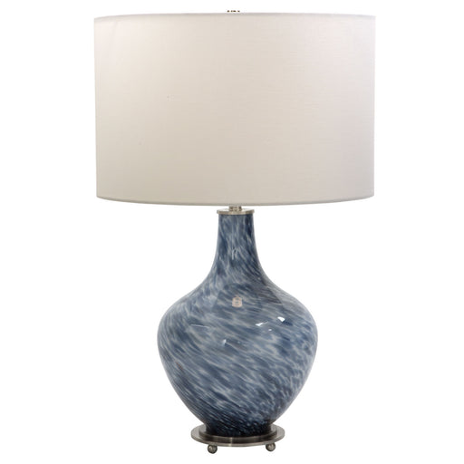 Reminiscent Of The Evening Sky, This Beautiful Table Lamp Features An Art Glass Base With Shades Of Navy, Cobalt And White Accented By An Elegant C...