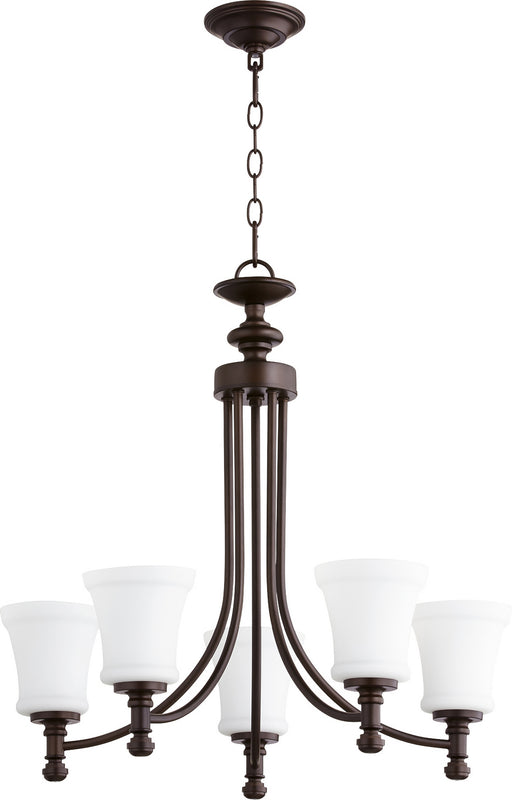 View full detailsQuorum 6154-5-186 Five Light Chandelier, Oiled Bronze w/ Satin Opal