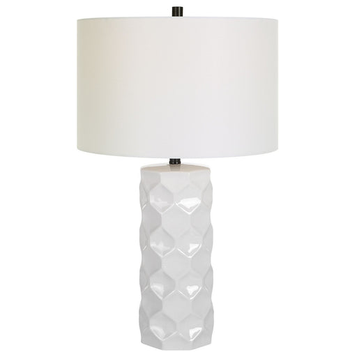 The Honeycomb Table Lamp Is Handcrafted From Ceramic In A Geometric Design Finished In A Gloss White Glaze, Accented With Satin Black Iron Details....