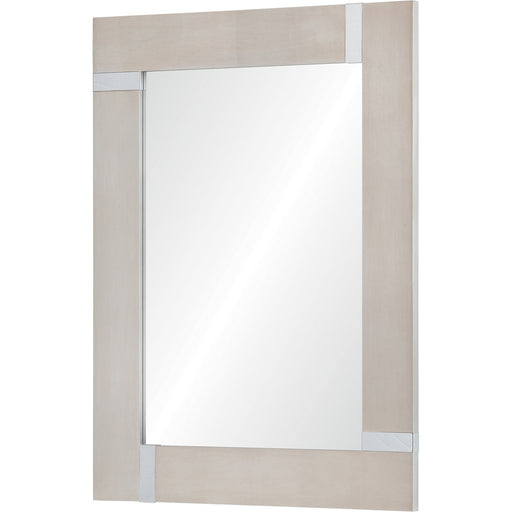 This modern mirror features a silver leaf finish highlighted with chrome corner accents. Mirror is beveled.Details:Product Type: Mirrors-Rect./Sq.F...