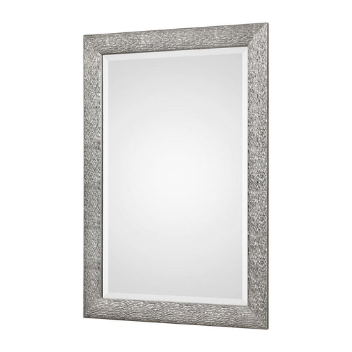 Heavily Textured Sloped Profile Finished In A Metallic Silver, Accented With A Fluted Antiqued Silver Edge. Mirror Features A Generous 1 1/4" Bevel...