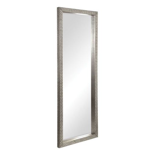 This Leaner Style Mirror Features A Solid Wood Frame Showcasing A Diamond Studded Texture On Front And Side, Finished In A Lightly Antiqued Metalli...