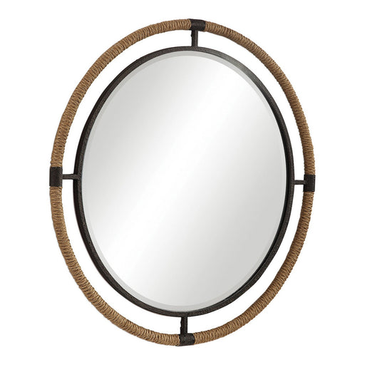 This Forged Iron Mirror Frame Is Finished In A Textured Rust Black That's Wrapped In Natural Rope Bringing A Coastal Feel To Any Room. The Round Mi...