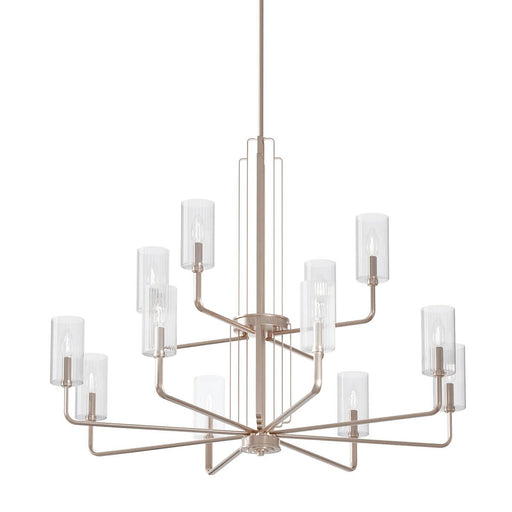The Kimrose 12 light chandelier is an Art Deco masterpiece. Its geometric shapes take center stage in a gorgeous mix of Polished Nickel and Satin N...