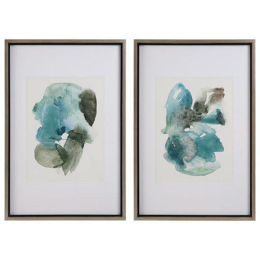 Capturing Remarkable Watercolor Composition, These Framed Prints Feature Abstract Images In Smoke Gray And Turquoise Blue. Each Print Is Accented B...
