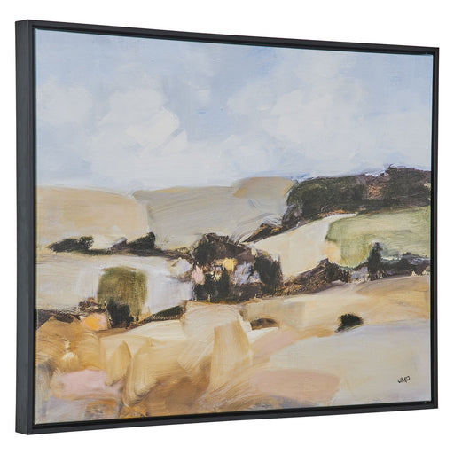 Giclee On Canvas, This Artwork Features A Stylized Field Of Gold, Tan, And Olive With A Sky Of Blue And Accented By Clouds Of White. A Solid Wood G...
