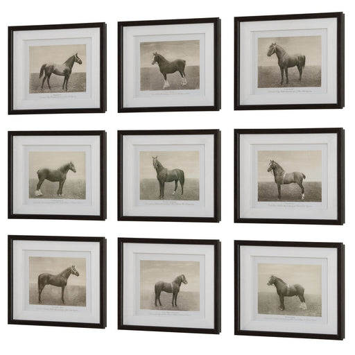 This Regal Set Showcases Nine Antiqued Sketches Of Horses Belonging To Dignitaries And Elite Members Of Society. Surrounded By A Beveled Wood Grain...