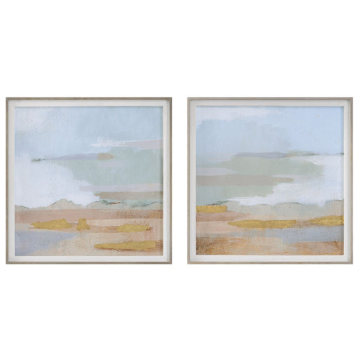 These Serene Landscape Prints Are Shown Under Glass Featuring Clay, Sage, And Light Blue Tones With Gold Leaf Accents. Each Print Is Accented By A ...
