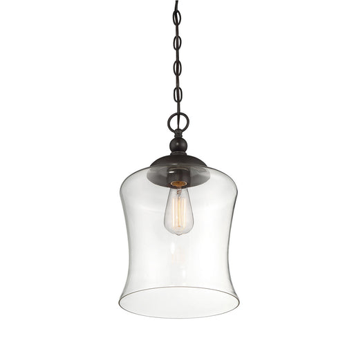 This 1-light pendant showcases a curving shade of clear glass and is finished in Oil Rubbed Bronze. 16.5" in height and 9.75" in width.Details:Prod...