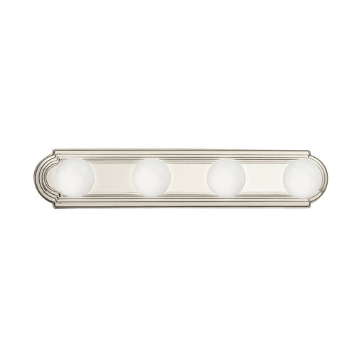 The sleek design of this 4 light bath light bar means it fits neatly into many decors and spaces. Brushed Nickel finish with 4 white globes.Details...