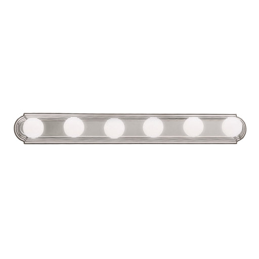 The sleek design of this 6 light bath bar means it fits neatly in many decors and spaces. Brushed Nickel finish with 6 white globes.Details:Product...