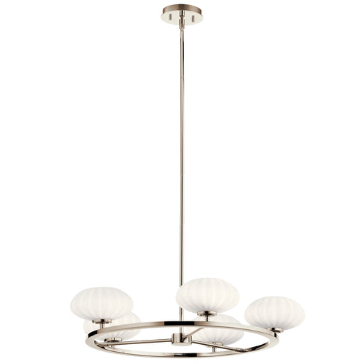 The Pim(TM) 40in. 5 light round chandelier features a nostalgic mid century modern design in Polished Nickel and rounded shaped satin etched cased ...