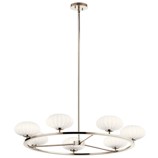The Pim 39" 6 light oval chandelier features a nostalgic mid century modern design in Polished Nickel and rounded shaped satin etched cased opal gl...