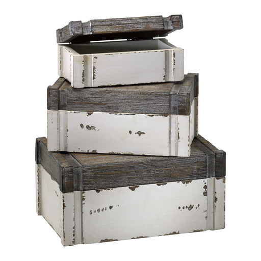 Alder BoxesDetails:Product Type: BoxesFinish: Distressed White And GrayMeasurements:Width / Dia: 6.75"Height: 5.00"Length: 10.50"Weight: 5.15lbs.La...