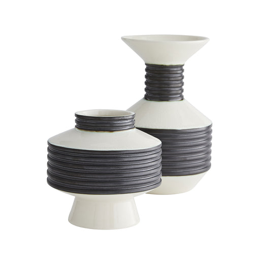 This set of bold graphic vases draws inspiration from industrial and traditional design. Unique in shape each porcelain vase features an ivory crac...