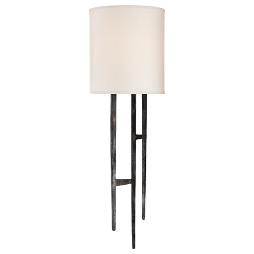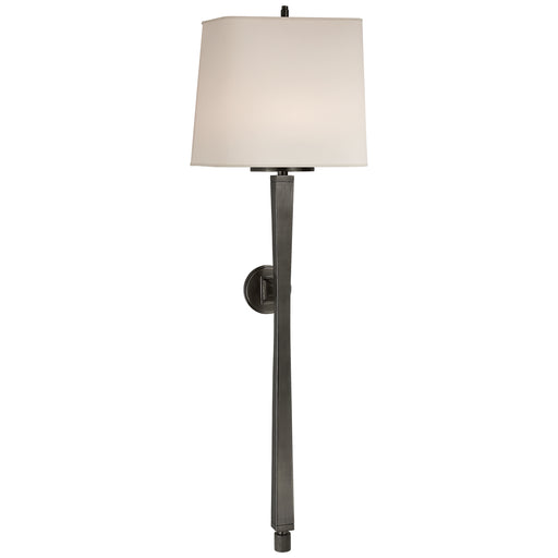 Michel Tail Sconce in Aged Iron with Natural Paper ShadeDetails:Product Type: Drum ShadeFinish: Aged IronShade: 8" X 8.75" X 8.25" Natural Paper Sh...