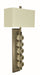 Round crystal balls and off white shade are accented with a brushed nickel finish