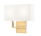 Rich and warm in an olde brass finish, this modern two-light wall sconce sets a refined tone in your living or dining room. It pairs angular arm and shade details with a squared wall plate, creating an understated silhouette that delivers bright illumination for excellent ambiance. The rectangular half-shade features white fabric, casting true illumination in any space.