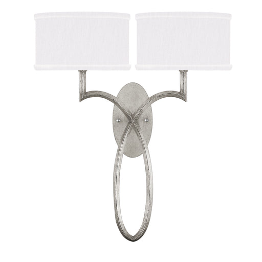 Sconce in a silver leaf finish with white fabric shades.Details:Product Type: Drum ShadeFinish: SilverShade: WhiteDesigner: Fine Art Handcrafted Li...