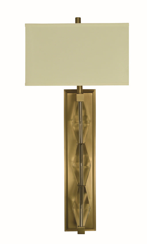 Large crystal column and off white shade are accented with a brushed brass finishDetails:Product Type: Drum ShadeFinish: Brushed BrassShade: Off-Wh...