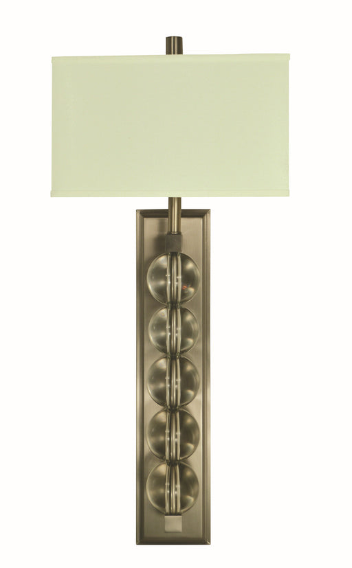 Round crystal balls and off white shade are accented with a brushed nickel finishDetails:Product Type: Drum ShadeFinish: Brushed NickelShade: Off-W...