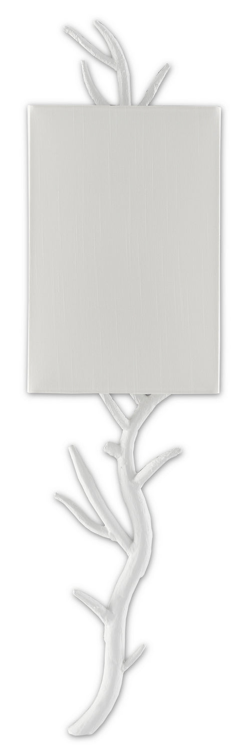 The Baneberry Wall Sconce, Right, is made of wrought iron in a Gesso white finish with flowing stems reaching through the off-white shantung shade....