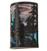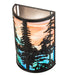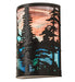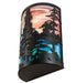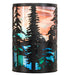 This curvaceous sconce features mesmerizing Pine Tree silhouettes that stand tall as the brilliant morning sun rises above a brilliant mountain lake in the background. Beautiful ambient light is projected through a stunning Purple, Blue, and Green art glass diffuser, complemented with decorative accents and hardware featured in a Black Satin Wrought Iron finish. It is ideal for illuminating hallways, dining areas, and other spaces in residential, hospitality, and commercial settings. The Tall Pines Wall Sconce is featured in our American-made, American-designed, handcrafted Nature Inspired Lighting Collection and manufactured in Yorkville, New York. UL and cUL listed for dry and damp locations.