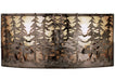 A stunning nature inspired stand of Tall Pines is depicted while the morning sun rises in the background. Warm soft ambient light is diffused beautifully through a long curve of Silver Mica and complemented with Antique Copper finished accents and frame. Handcrafted in the Meyda manufacturing facility, located at the foothills of the Adirondack Mountains.