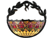 PEARLESCENT BEIGE GLASS PANELS WITH PLUM PINK COLONIAL TULIPS SETTING ATOP SPRING GREEN LEAVES ARE ACCENTED WITH AMETHYST JEWELS AND WAVES OF MAHOGANY GRANITE GLASS. THE MAHOGANY BRONZE FINISHED WALL SCONCE BRACKET REPEATS THE PATTERN WITH SWIRLING LEAVES AND FLOWER BUDS.