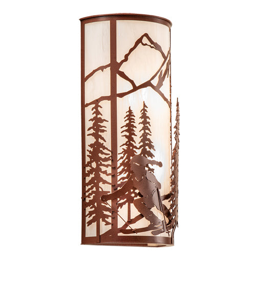 A stand of Tall Pines accent this nature inspired wall sconce. The fixture is finished in Antique Copper, has Silver mica panels, and is handcrafte...