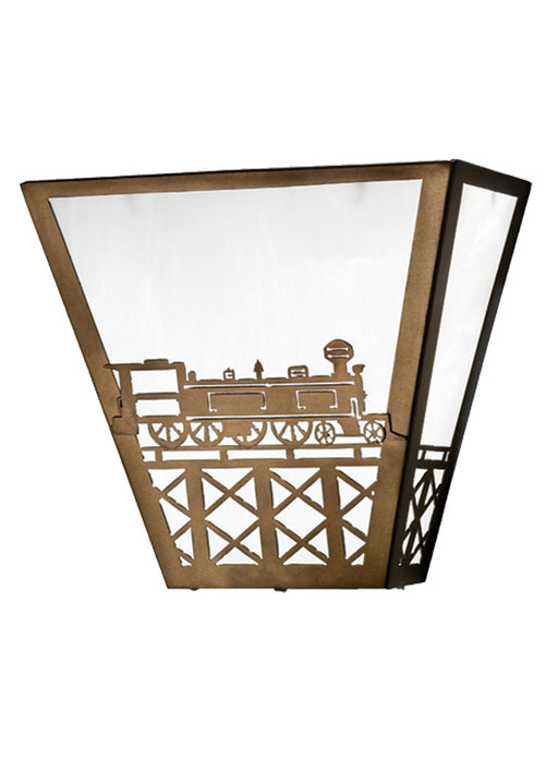 A Train takes a scenic ride along the waters edge of this charming wall sconce. The fixture is finished in Antique Copper, has White art glass pane...