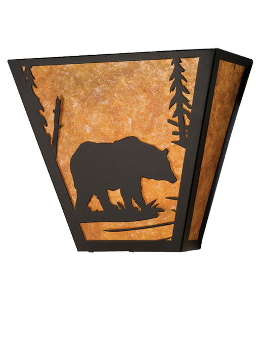 An Elk in the forest is depicted on this wall sconce. The fixture is finished in Earth, has Silver mica panels, and is handcrafted in the USA by Me...