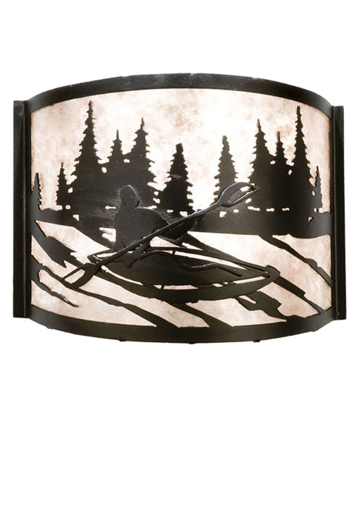 A whitewater boater is depicted paddling a kayak through a scenic class 4 drop on this wall sconce. The fixture is finished in Textured Black and f...