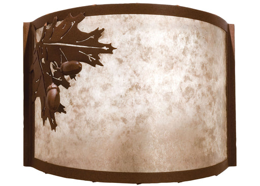 Acorn and Oak leaves accent this nature inspired wall sconce. The fixture is finished in Rust, has Silver mica panels, and is handcrafted in the US...