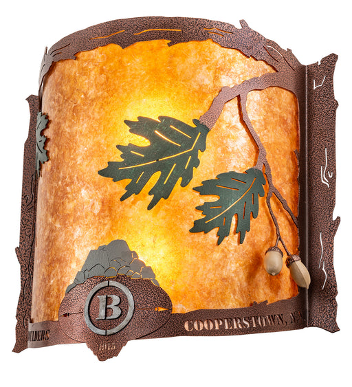 This alluring wall sconce features Copper Vein finished Oak Leaves that shine brilliantly on an Amber Mica background. This sconce is personalized ...