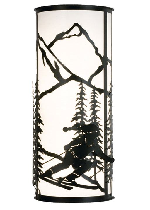 A winter skier slaloms down a snow covered mountain with Pine Trees on this wall sconce. The fixture is finished in Black, has White glass panels, ...