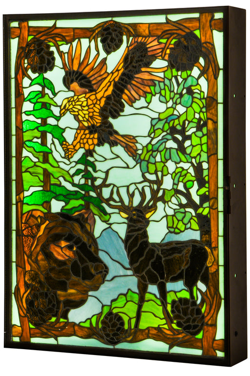 Bring the great outdoors to your interiors with this striking wall sconce featuring a deer scampering alongside a mountain lake as the morning sun ...