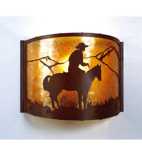 A lone cowboy and his trusty horse stand before majestic mountains on this Western inspired wall sconce. The fixture is finished in Rust, has Amber...