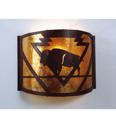 A Buffalo framed in a Native American arrowhead is featured on this rustic wall sconce. The American Bison fixture is finished in Rust, has Amber M...
